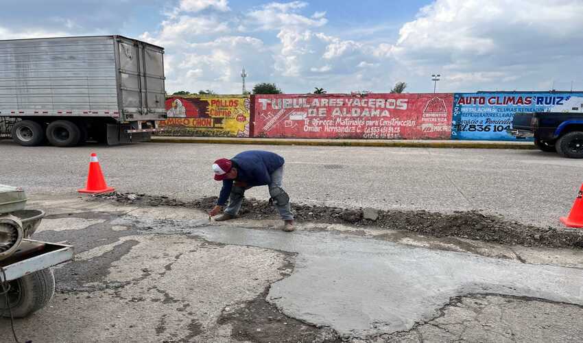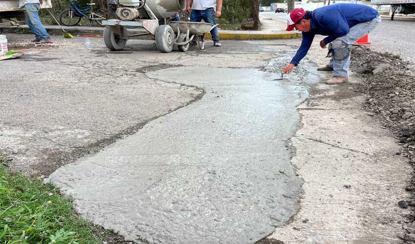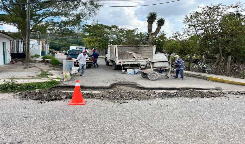 El equipo de Obras Públicas, bajo la dirección de la presidenta municipal Mimí Sosa, llevó a cabo trabajos de reparación en un bache ubicado en la colonia Arboledas, específicamente en la calle Nogal, frente al campo de béisbol.