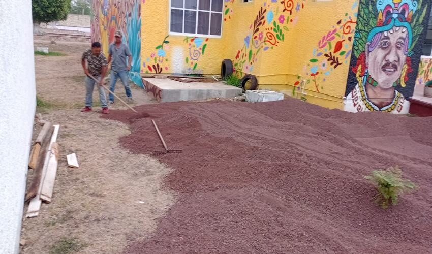 Aplicación de gravilla de tezontle en las áreas exteriores de la Casa de la Cultura.